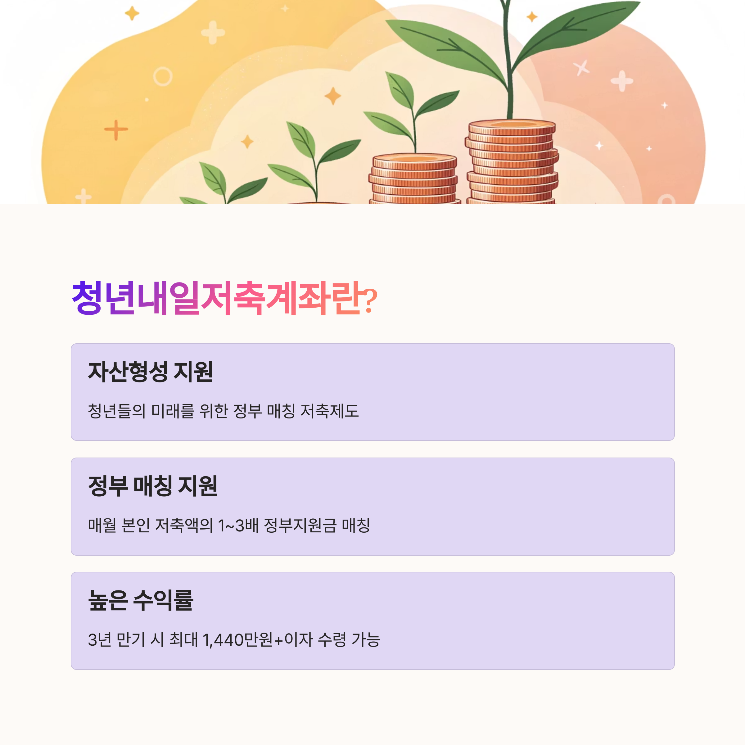 '청년내일저축계좌'는 일정 요건을 충족하는 청년이 매월 일정 금액을 저축하면 정부가 추가 지원금을 매칭해 주는 자산형성 지원사업입니다. 소득이 일정 수준 이하인 청년들을 대상으로 하며, 꾸준한 저축을 통해 안정적인 미래를 준비할 수 있도록 돕습니다.